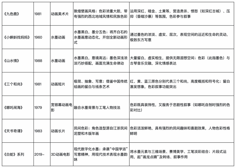 从表格中可以看出,上美影的色彩美学丰富而深邃,有强烈的民族风格的自觉追求。上美影的首任厂长特伟提出了“探民族风格之路”的口号。其作品色彩并非简单模仿自然,而是从中国传统艺术(敦煌壁画、水墨画、民间年画、泥塑、建筑彩绘、京剧脸谱)中汲取营养,形成了独具东方韵味的色彩语言体系。