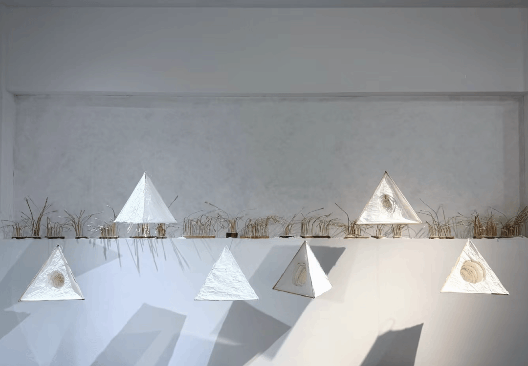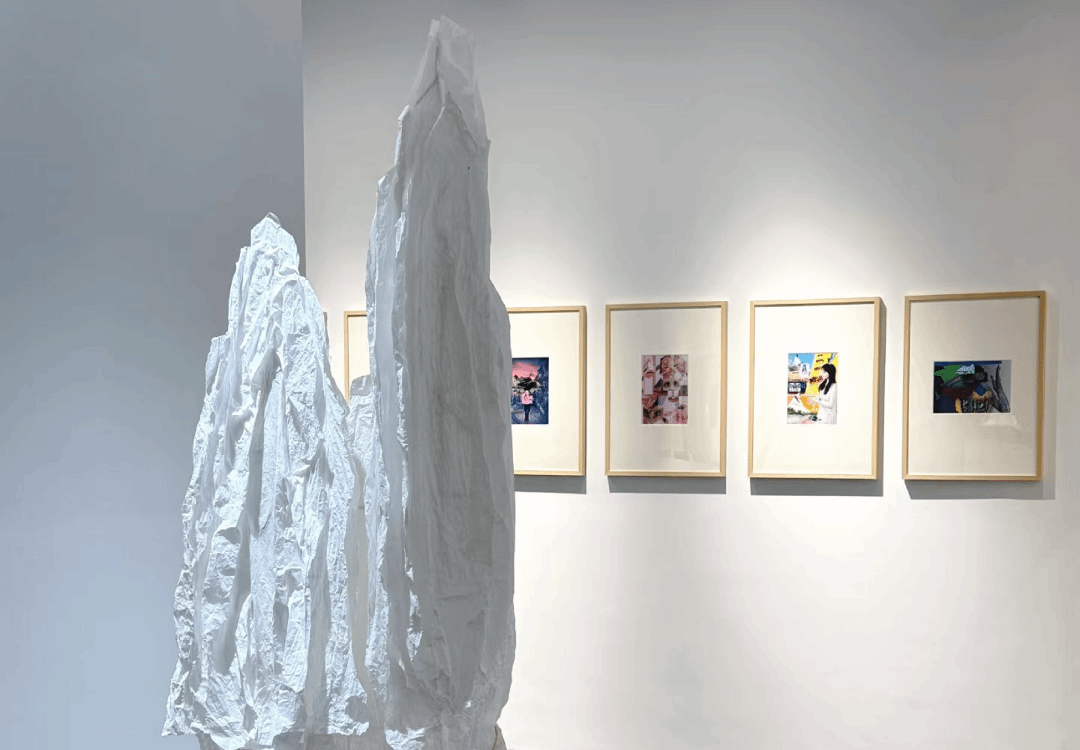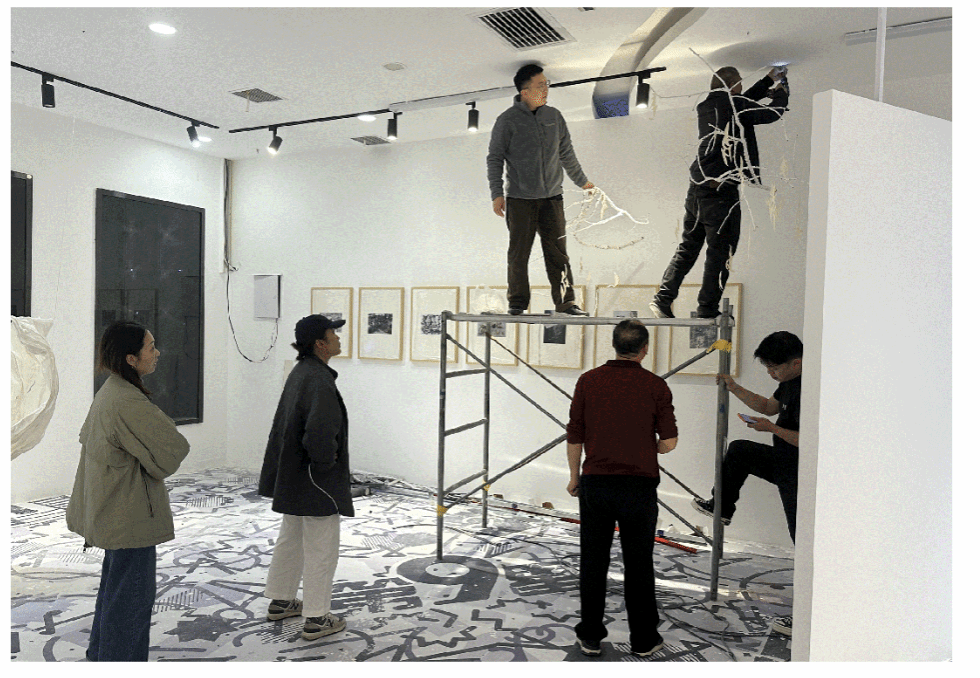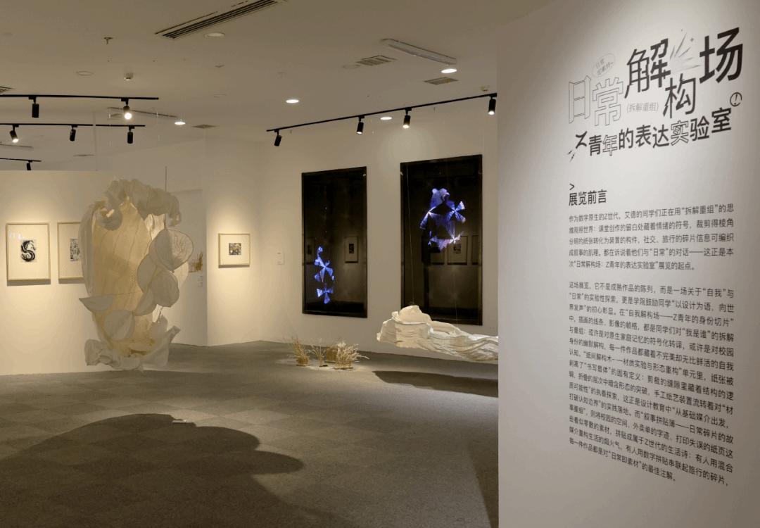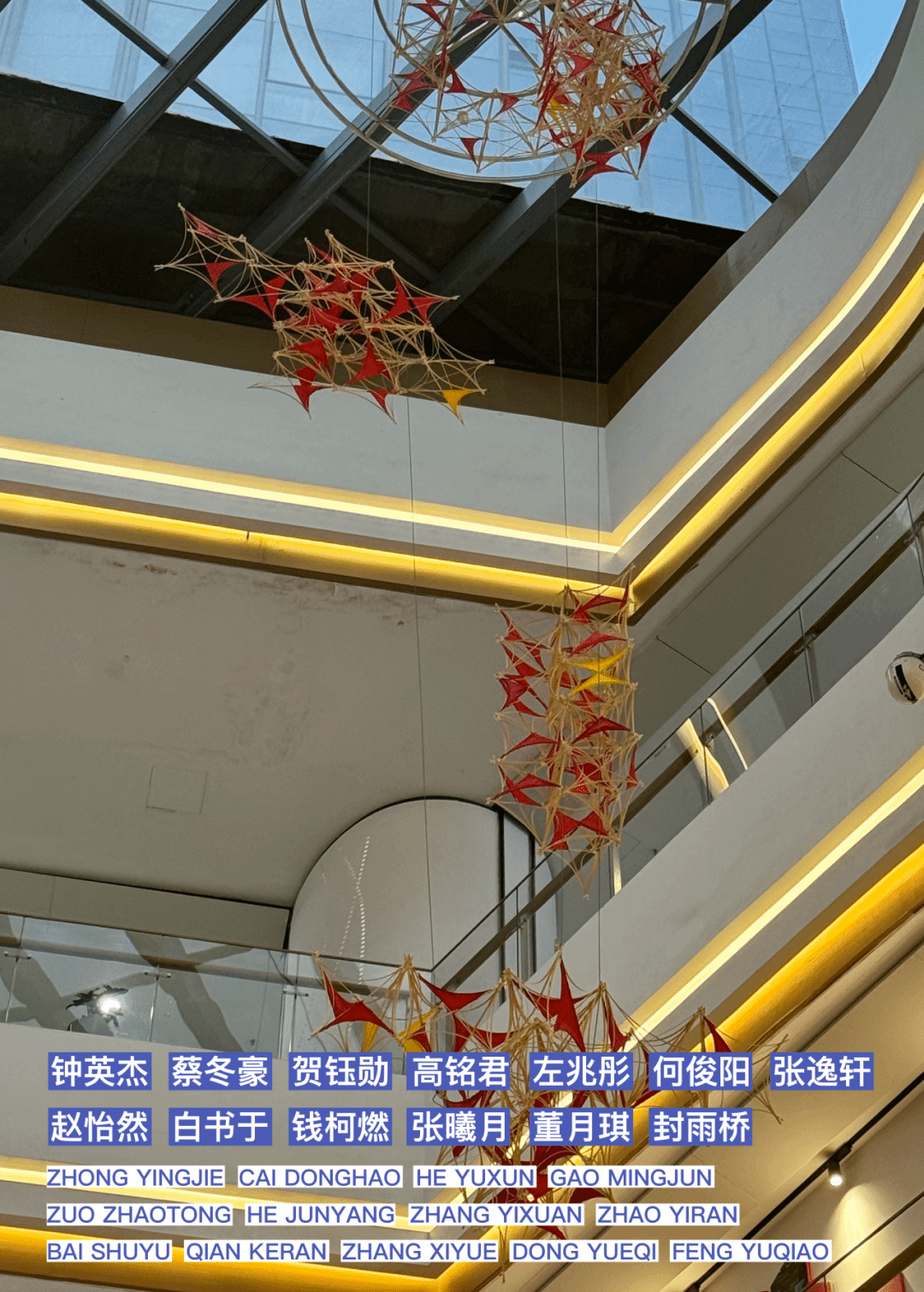 “作为数字原生的Z世代,艾德的同学们正在用‘拆解重组’的思维观照世界:课堂创作的留白处藏着情绪的符号,裁剪得棱角分明的纸张转化为装置的构件,社交、旅行的碎片信息可编织成叙事的肌理。”展览前言中的这段表述,正是同学们创作理念的生动注脚。展览设置三大单元,全方位呈现实践教学成果。悬吊装置作品《赤金织缕》由五个形似微型建筑的装置组成,每一处绳结与杆件的连接都体现了力学的精妙,每一根竹条的弯曲都充满视觉的张力,展现出作品对空间、结构与材料互动关系的大胆畅想。