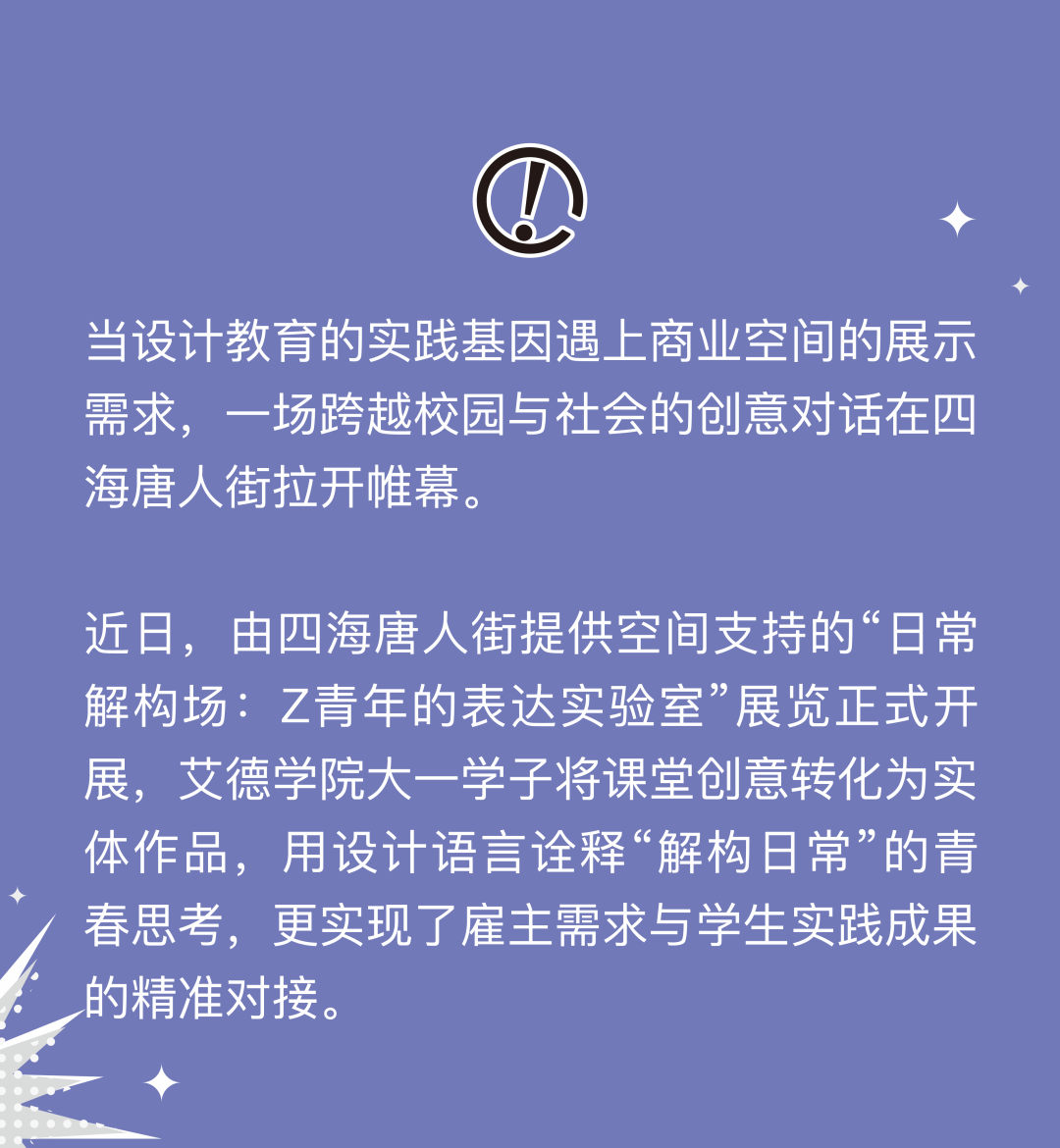 即日起,这场连接学术与实践、校园与市场的创意展览持续开放。欢迎走进四海唐人街“表达实验室”,与艾德Z青年创作者一同,在解构与重构之间,读懂新一代设计力量的成长与表达!