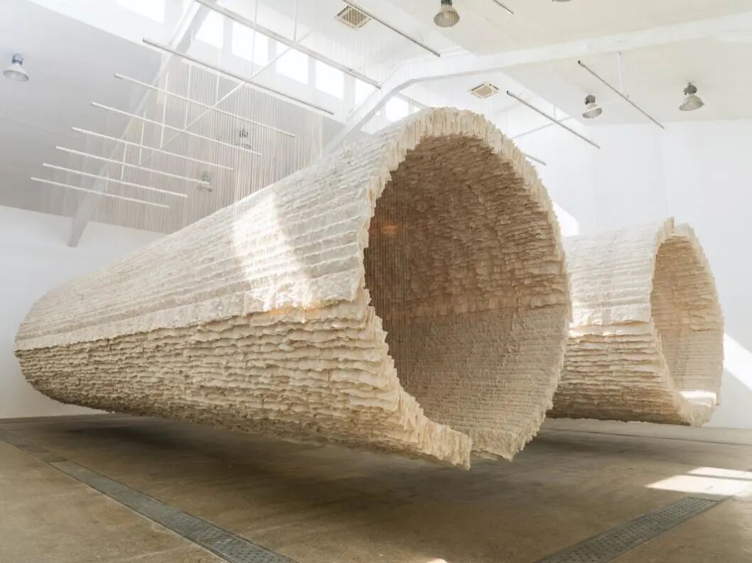 在当代中国,纸的立体化探索尤为丰富。艺术家朱金石曾在作品《时间的船》中,将宣纸的特质与表达的思想有机地结合起来,物质的柔脆与作品的坚实同时在场,制作作品的时间也被包含其中。艺术家李洪波的《伸缩纸张雕塑系列》使用数千层纸粘合成可伸缩的雕塑,形体在伸展中获得生命的呼吸。当雕塑伸展时,纸的柔韧性成为对“身份与形态”的隐喻。
