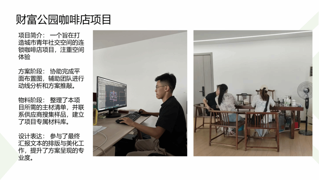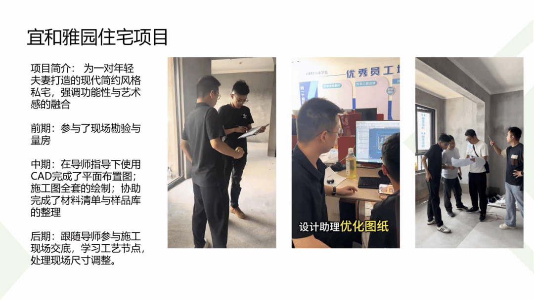 这段实习让我深切体会“设计源于需求”。只有到现场丈量不合理尺度,在图纸上反复推敲构造,我才真正懂得设计的深度来自对可落地的敬畏。我不仅提升了专业能力,也在团队协作与多轮修改中学会“先完成再完美”的务实逻辑。这段经历照出我的认知边界,促使我今后深耕专业的同时,主动拓宽跨领域视野。