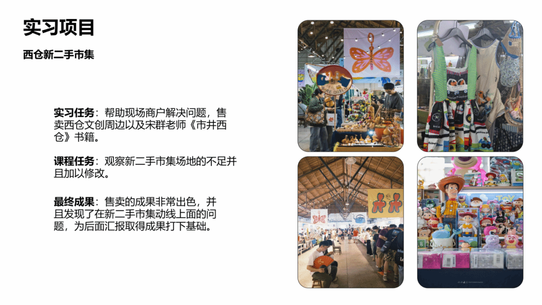在西仓这三个月的实习,让我对「市场」有了全新的理解。从一开始的忐忑生疏,到后来能从容地向顾客讲述每件产品背后的故事,这段经历远比我想象中更丰富。我不再只是完成销售任务,而是学着去观察摊位间的运作逻辑,从客流变化中读懂市场的呼吸,也在和摊主、顾客的交流里触摸到商业真实的人情温度。最终能在学校的任务汇报中获得个人最佳实践力一等奖和小组最佳商业洞察奖,我想正是这段经历给予我的最好回响。感谢西仓这个充满生命力的课堂,也感谢所有帮助过我的前辈。这些收获,我会一直珍藏。