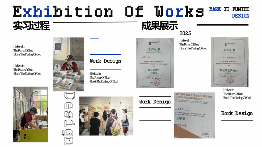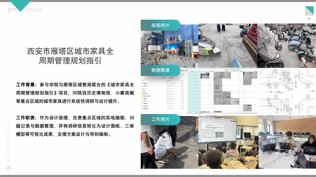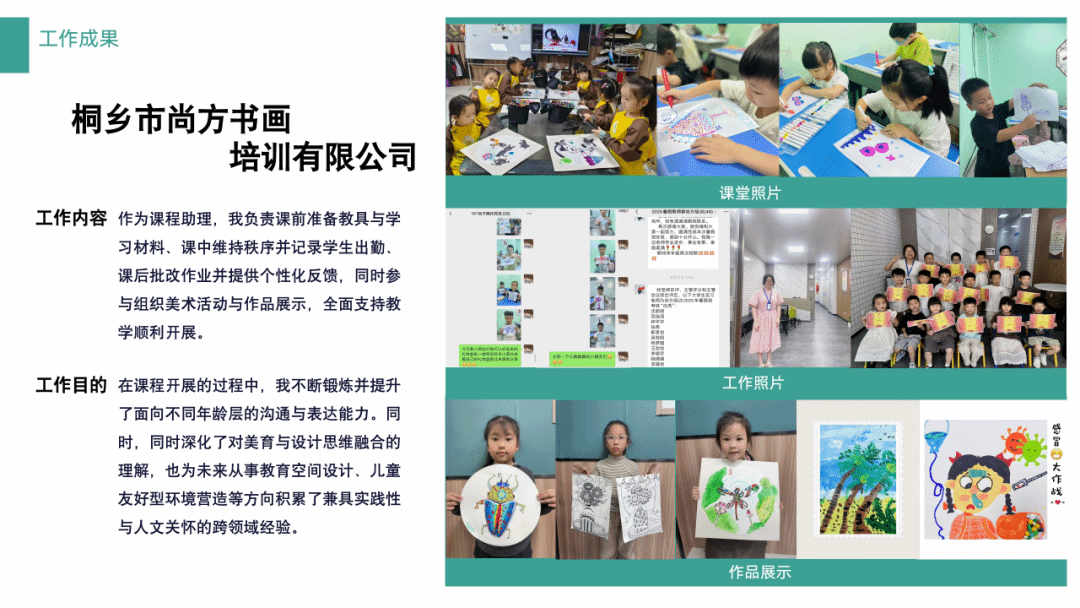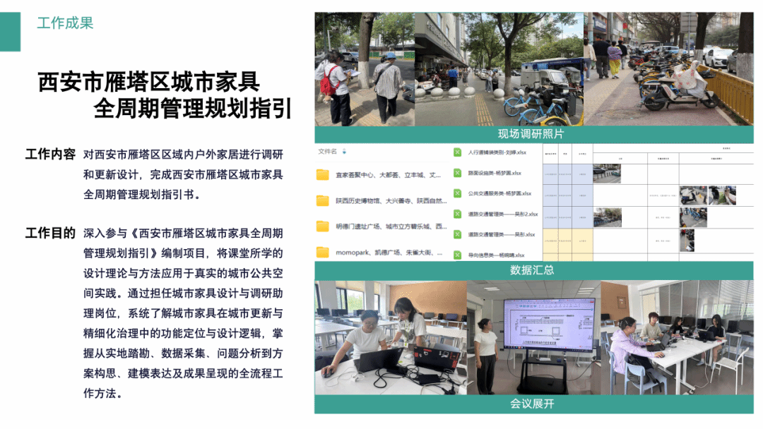 在实习期间,我先后参与了《西安市雁塔区城市家具全周期管理规划指引》编制项目,并在桐乡市尚方书画培训有限公司担任教学助理。前者让我深入城市公共空间,通过实地调研、数据整理与方案讨论,理解了设计如何服务于城市精细化治理;后者则让我走进教育现场,体会到美育对儿童成长的深远影响。这两段看似领域迥异的经历,却共同强化了我对“以人为本”设计原则的认知,它们的核心都在于关注人的需求、行为与情感。这不仅拓宽了我的专业视野,也让我更加坚定地希望在未来的设计工作中融合社会关怀与人文温度。