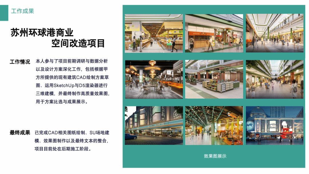 通过参与学校真实项目实习,我深刻体会到将理论知识转化为实践能力的重要性。在项目中,我承担了初步分析与后期效果图展示工作,亲身体验了从发现问题、方案设计到方案落地的完整流程。过程中,我不仅巩固了专业知识,更是对软件方面有了很大的提升,在团队中有效沟通、配合进度,应对真实项目中突发的问题。这次实习让我明白,好的设计不仅具有一定的美感,更是技术与实践的配合。对空间、材料与工艺的深刻理解,也为我未来的专业发展奠定了扎实基础。