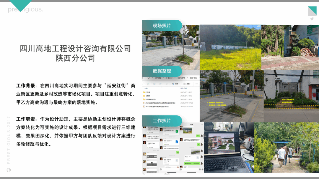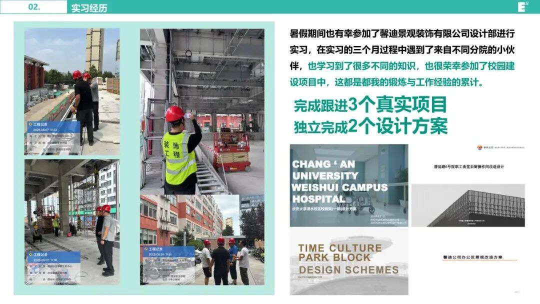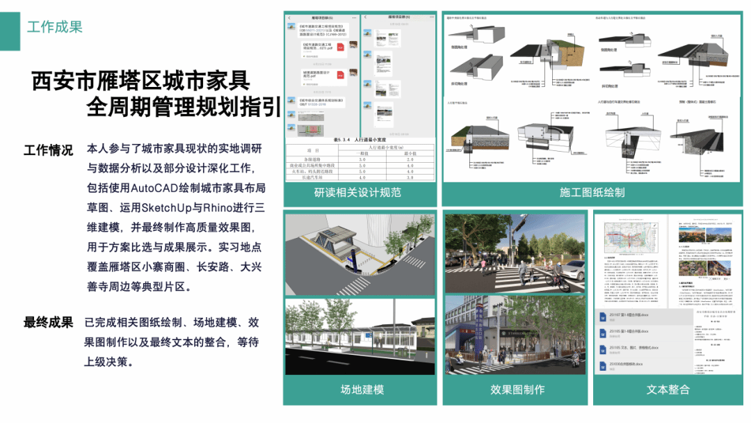 两段实习,从理论到落地,串起我完整的设计成长。在西安市雁塔区城市家具全周期管理规划指引项目中,我通过实地调研将课堂知识转化为具体方案,初步掌握了从需求分析到方案深化的设计逻辑。而在陕西馨迪景观装饰工程有限公司的项目跟进中,我进一步学习协调多方需求,独立完成设计与汇报,实现了从执行者到协作者的角色转变。这段经历不仅提升了我的专业软件技能,更让我体会到设计不止于图面,更在于沟通、协调与实现。未来,我希望能继续带着对现实的观察与关怀,在真实场景中持续耕耘,做出真正扎根于地的设计。