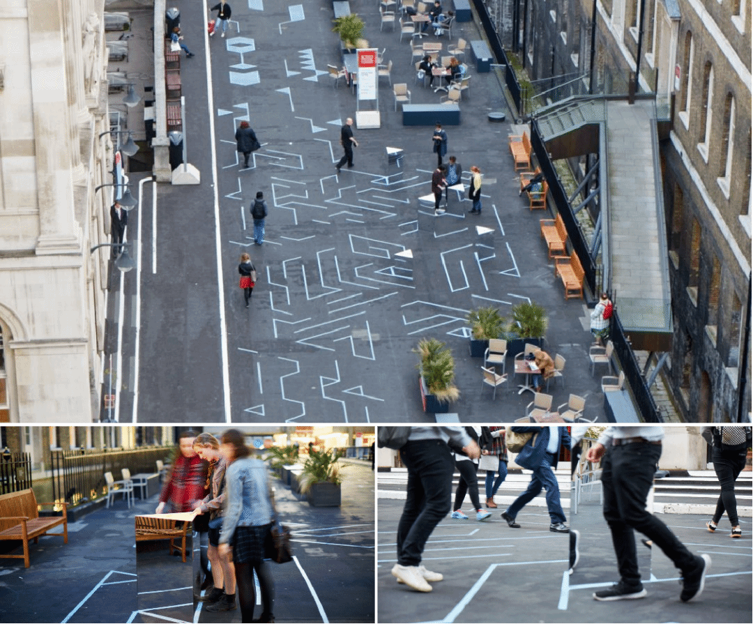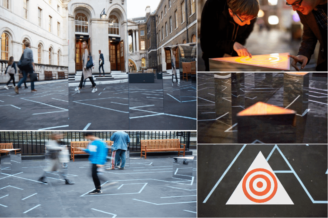 由Matheson Marcault工作室设计的“One Easy Step”项目位于伦敦国王学院公共广场,通过在地面绘制引导性线条与图案,并设置带有小型游戏(如迷宫、字母游戏)的镜面基座,巧妙地构建了一个城市游戏场。该设计以低技术、高互动性的方式,邀请并鼓励过往的行人自发地参与到轻松愉快的身体与社交游戏中,重新激活了公共空间的使用方式。