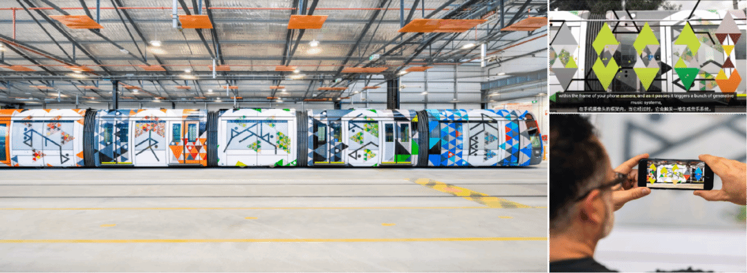 Troy Innocent设计的“可玩艺术电车”是一件将墨尔本32.5米长的有轨电车转变为动态乐谱的公共艺术作品。该作品利用增强现实技术,使乘客能通过智能手机摄像头扫描行驶中的电车车身,将其独特的运动状态(如静止、加速、匀速行驶及减速)实时转化为一段段相应的音乐,其交互过程犹如自动钢琴在读取乐谱。
