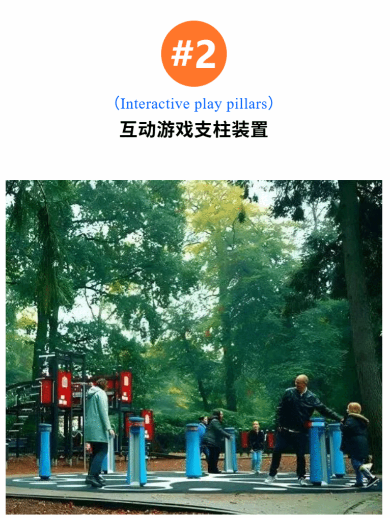 互动游戏支柱装置(Interactive play pillars)通过七根配备360°触摸屏的立柱构成一个互动集群,将游戏、教育与体能训练整合于户外场景之中,体现了将数字互动嵌入日常环境的设计方向,是数实融合游乐场域的典范实践。该设计采用开放式设计策略,摒弃固定玩法,构建了支持游戏模式多样性的开放空间,涵盖认知、体能、语言及团队协作等多种类型,鼓励游戏者自主探索与创造。