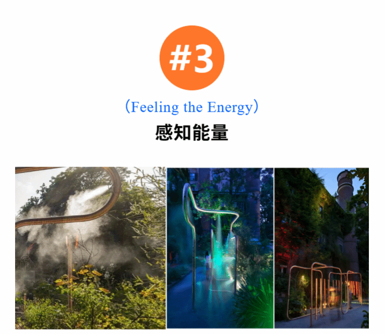 位于米兰历史悠久的植物园内的“感知能量”(Feeling the Energy)装置,利用500米数字弯曲铜管与有机光伏板,构建了一个数字与自然无缝融合的游乐场域,将历史植物园转化为一个开放式、可持续的互动游乐景观。其设计灵感源自植物的有机功能,铜管结构如同植物的维管束,吸收并在特定路径上释放能量,完美诠释了“技术作为自然催化剂”的原则。在这个数实融合的景观中不预设单一玩法,鼓励游客在旋转、触碰、穿行与光影交互中,自主探索能量从阳光、风与人体运动中生成、传递与储存的全过程。无论是通过旋转木马体验运动产生的能量,在风铃中演奏音乐,还是调整光伏板方向来直观感受能源的生产与转化,都体现了对开放式探索的支持。