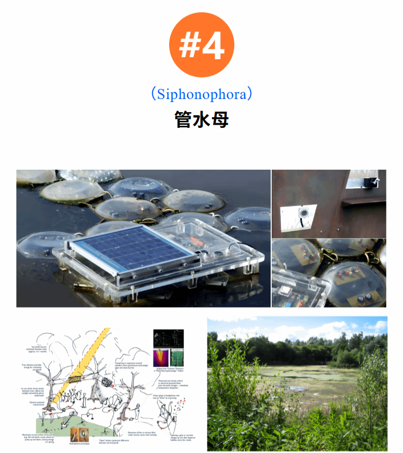 管水母(Siphonophora)是 Gunpowder Park(UK)公园湖面的一系列漂浮的、半透明的“细胞”装置,它们能感知光线、温度、声音、pH值及生物活动等环境数据,并通过发出声音和移动进行响应。同时,在岸边的观鸟屋内,访客可以通过水听器聆听水下世界,甚至使用手摇发电机向水中装置发送信号进行“对话”,允许游客向湖中“输入能量”,从而“喂养”并吸引装置的水上部分。
