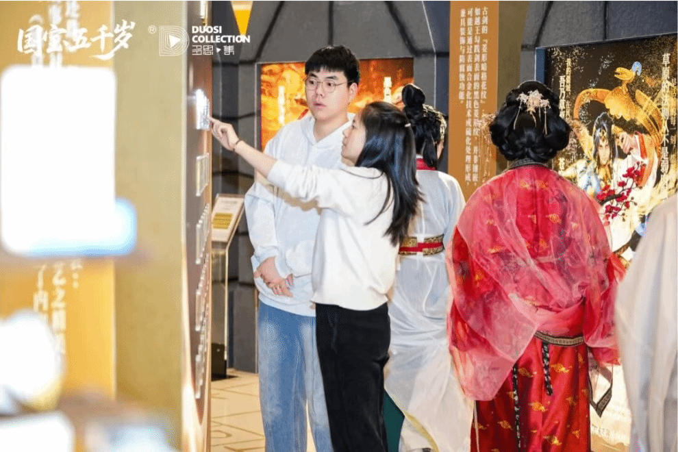 前期筹备阶段,师生团队与多思集团队多次研讨,深入挖掘文物背后的历史故事与文化内核,结合青年文化的传播特性,确定“轻盈化表达、沉浸式体验”的核心思路。在方案策划环节,学生们主动查阅文博资料、分析同类展览案例,结合受众需求设计互动形式,最终敲定国宝翻翻乐、卡牌收集等趣味环节,让知识传播更具吸引力。
