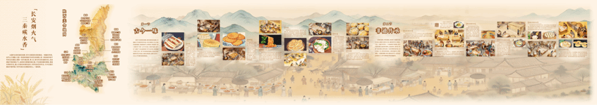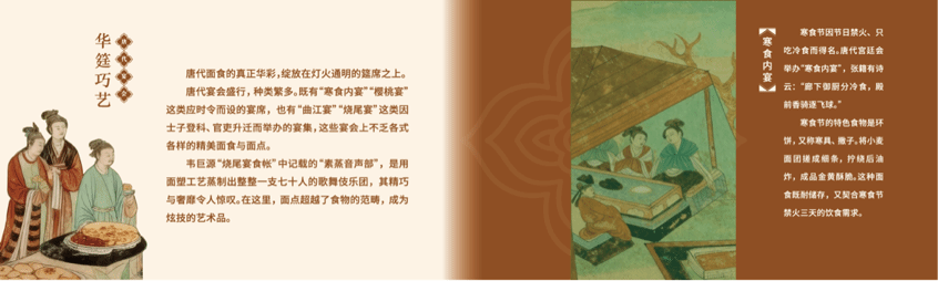 师生团队深挖唐代面食文化内涵,从唐代壁画、器物、文献中提取视觉元素与文化符号,结合现代设计美学,完成了展览视觉体系、展陈空间、互动物料等全维度设计创作。