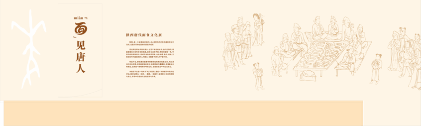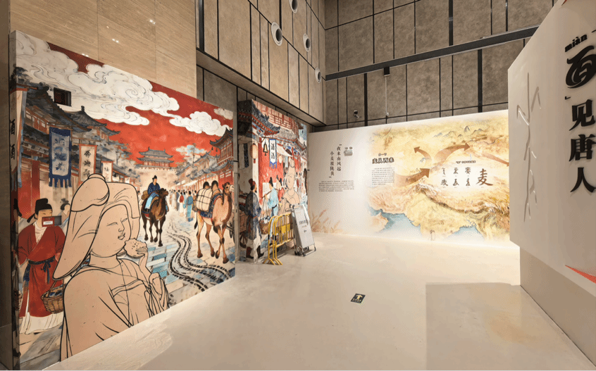 本次展览以唐代面食为核心脉络,打破传统展览的刻板模式,由“西有东西”工作室将视觉设计与传统文化深度融合,把千年面食文化以年轻化、潮流化的形式呈现,让厚重历史变得可看、可感、可互动。
