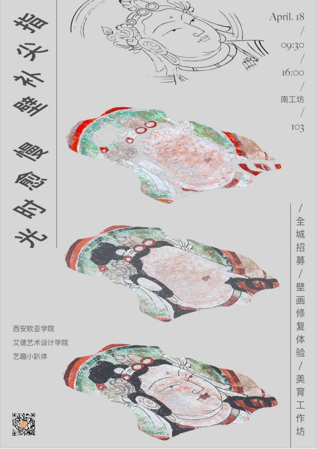 在步履不停的日常里,总需要一段慢下来的时光,以细腻对抗浮躁,以专注治愈内心。本次壁画修复体验课是由西安欧亚学院艾德艺术设计学院学科平台组倾力打造,面向社会的精品美育课程,特邀陕西考古博物馆特聘专家宋宏伟先生亲授,兼顾专业知识与轻量体验,让零基础的你也能亲手触摸千年壁画的美学肌理,在一补一绘间,完成一场与历史、与自我的温柔对话。