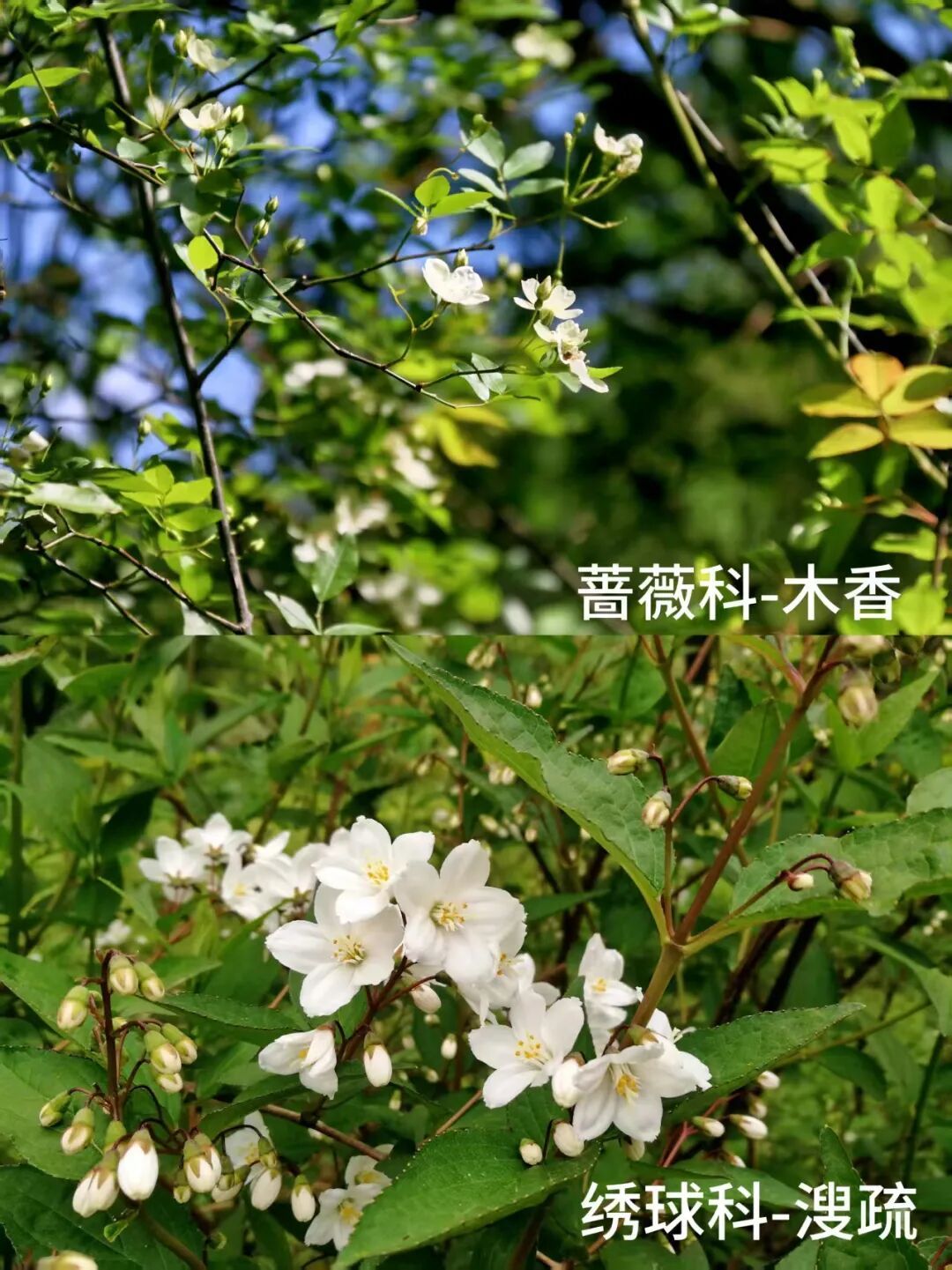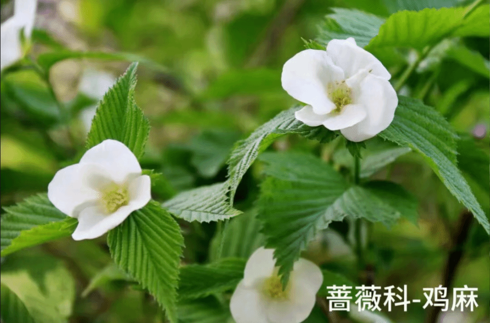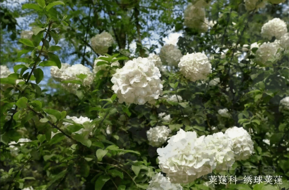 漫步至蔷薇园周边,木香正悄然登场。花虽小但数量繁密,开花时节满枝披雪,香气袭人。一旁的溲疏正值盛花期,小花密密匝匝缀满枝头,远望如霜似雪。而在不远处,绣球荚蒾(琼花)正值佳期,那宛如蝴蝶般聚拢的洁白花序亭亭玉立,古人赞其“无双亭下枝,占尽天下白”(宋·向子𬤇),将这份素雅演绎得淋漓尽致。还有鸡麻也不甘示弱,紫褐色的枝条舒展,托出朵朵纯白淡雅的素花,为这幅清丽画卷添上独特一笔。