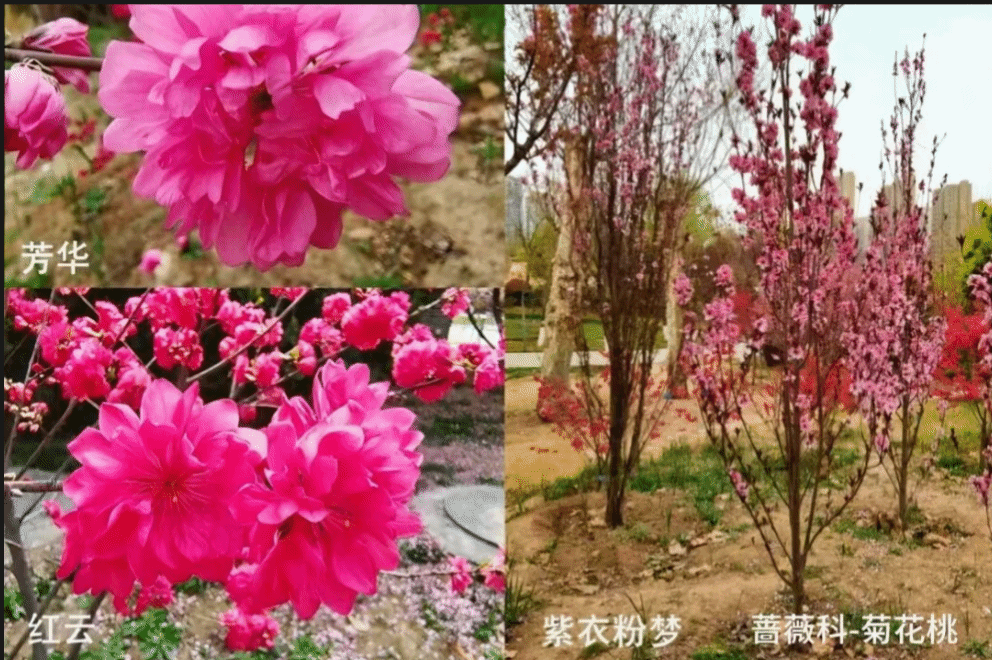 西安植物园的桃花园引种了30余种观赏桃,其中菊花桃、帚桃等是园区重点推广的观赏类型;园方还先后选育出芳华、紫衣粉梦、红云等具有自主知识产权的桃花新品种,花色粉红至红色,花型、叶色或树形各具特色,丰富了桃园的粉色层次。