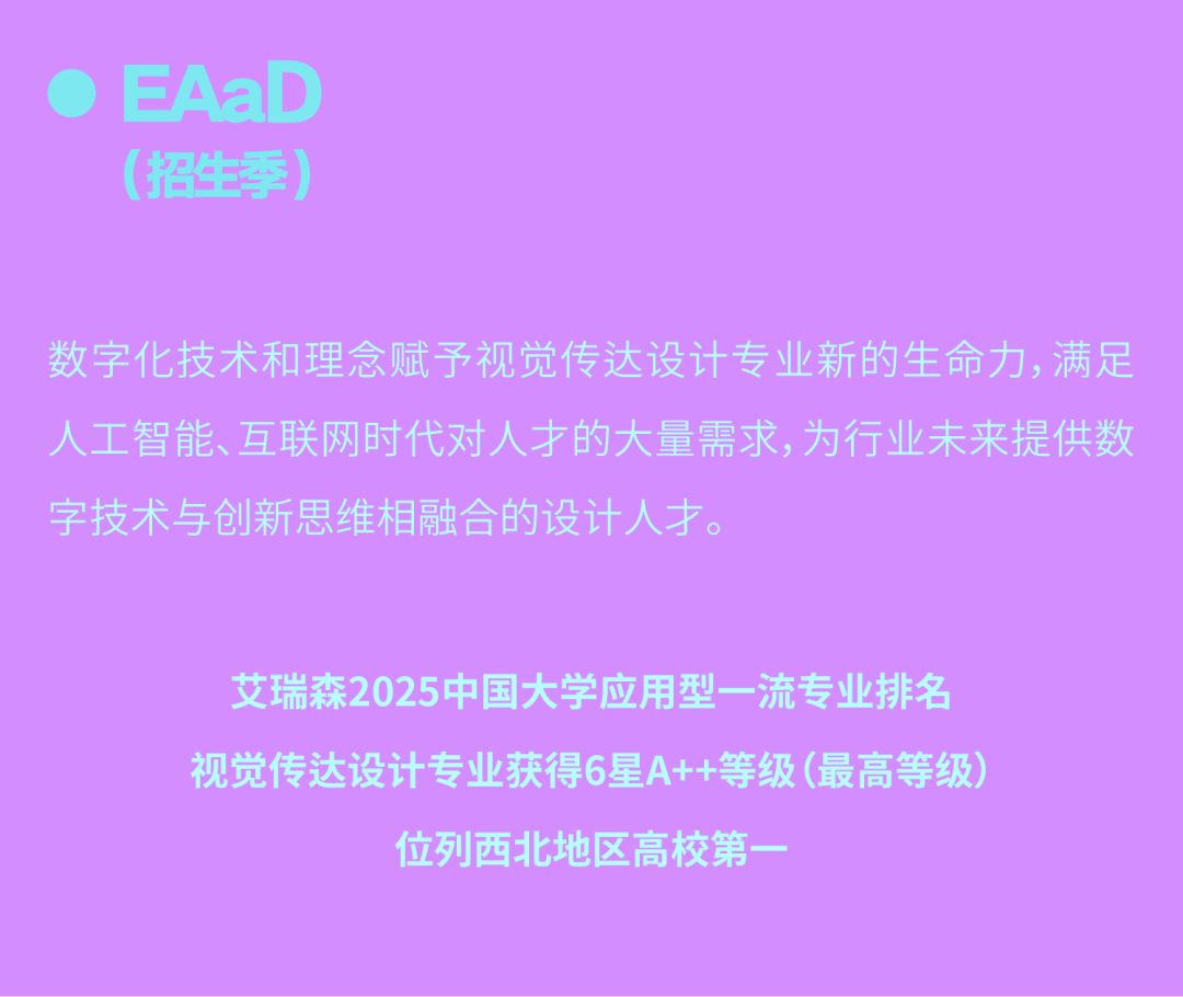 视觉传达设计专业注重视觉设计能力与解决问题能力的培养,融合知识、技术与设计能力培养于一体,以课题制/项目制为主要的教学模式,以“课内教学+集中实践+真实项目”为培养路径,持续与行业头部企业合作,面向互联网、新媒体与体验经济的全球背景,注重技术与艺术、传统与现代、信息与交互的多维联结与融合,通过信息可视化、品牌形象、动态展示、环境视觉等核心知识的学习,培养能够运用跨媒介的多维视觉语言与系统化的策略进行整合设计的设计师。