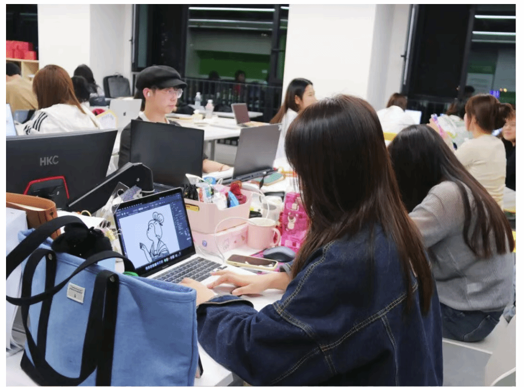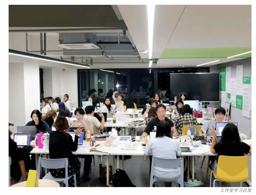 工作室打破 “固定课时” 的传统壁垒,把 “课堂” 延伸到日常每一处。教室预留专属工位,学生遇到软件操作、设计思维、版面编排的问题,转头就能找老师请教;老师围绕学生薄弱点 “精准投喂”,从案例拆解到细节打磨,让知识学习与学生的实际需求 “零距离对接”,避免 “学用脱节” 的困境。