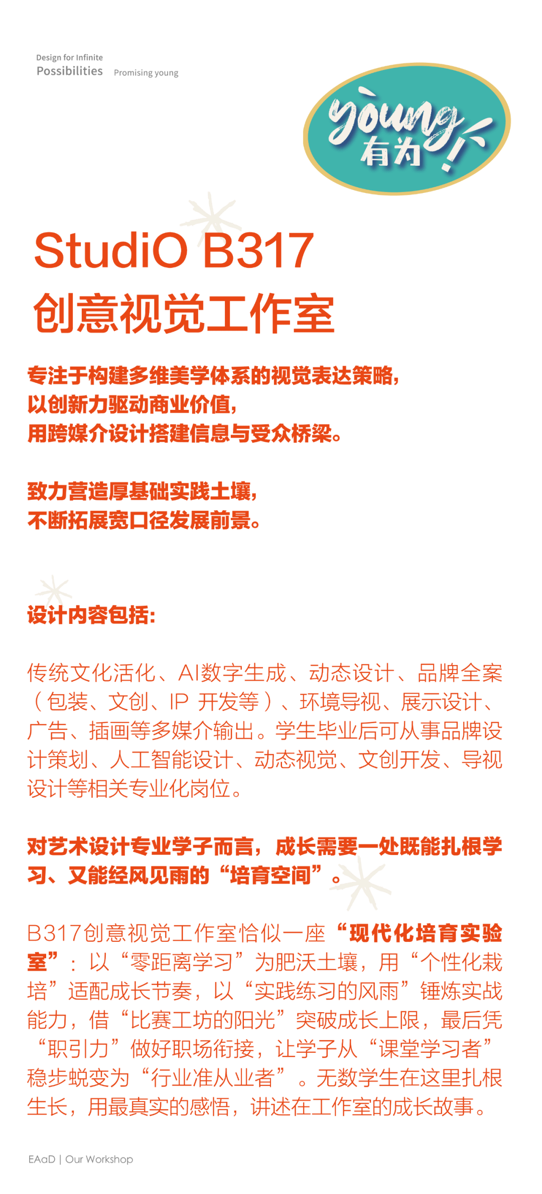 “零距离土壤” 让知识贴紧需求,“个性化栽培” 让痛点有多种解法,“实践风雨” 让能力被检验历练,“赛事阳光” 让上限不断突破,“职引力” 让职场完美衔接 ——B317 创意视觉工作室用这样环环相扣的培育逻辑,为视觉传达学子搭建了 “从扎根到结果” 的完整成长路径。