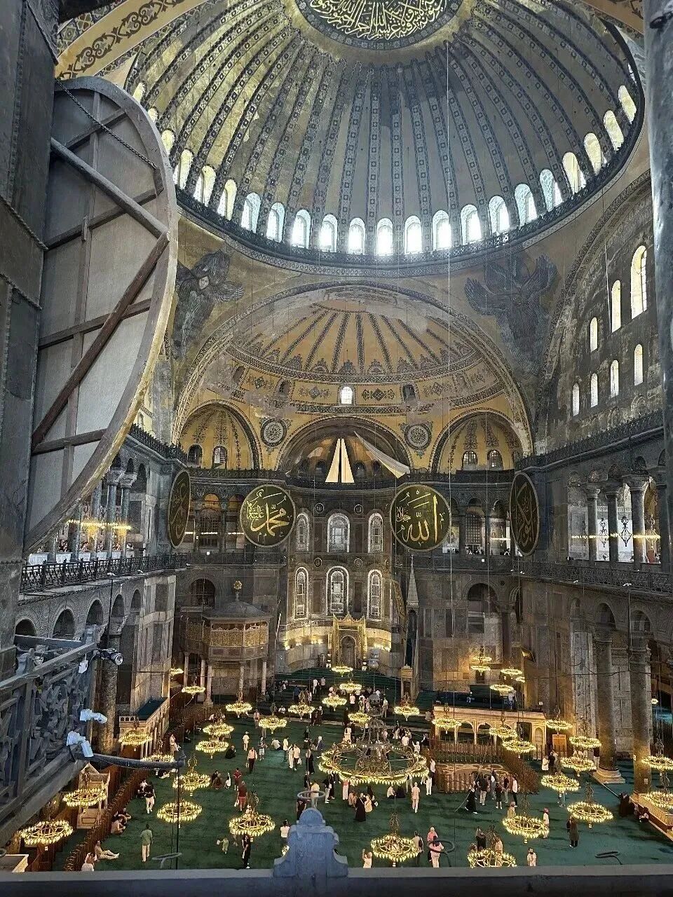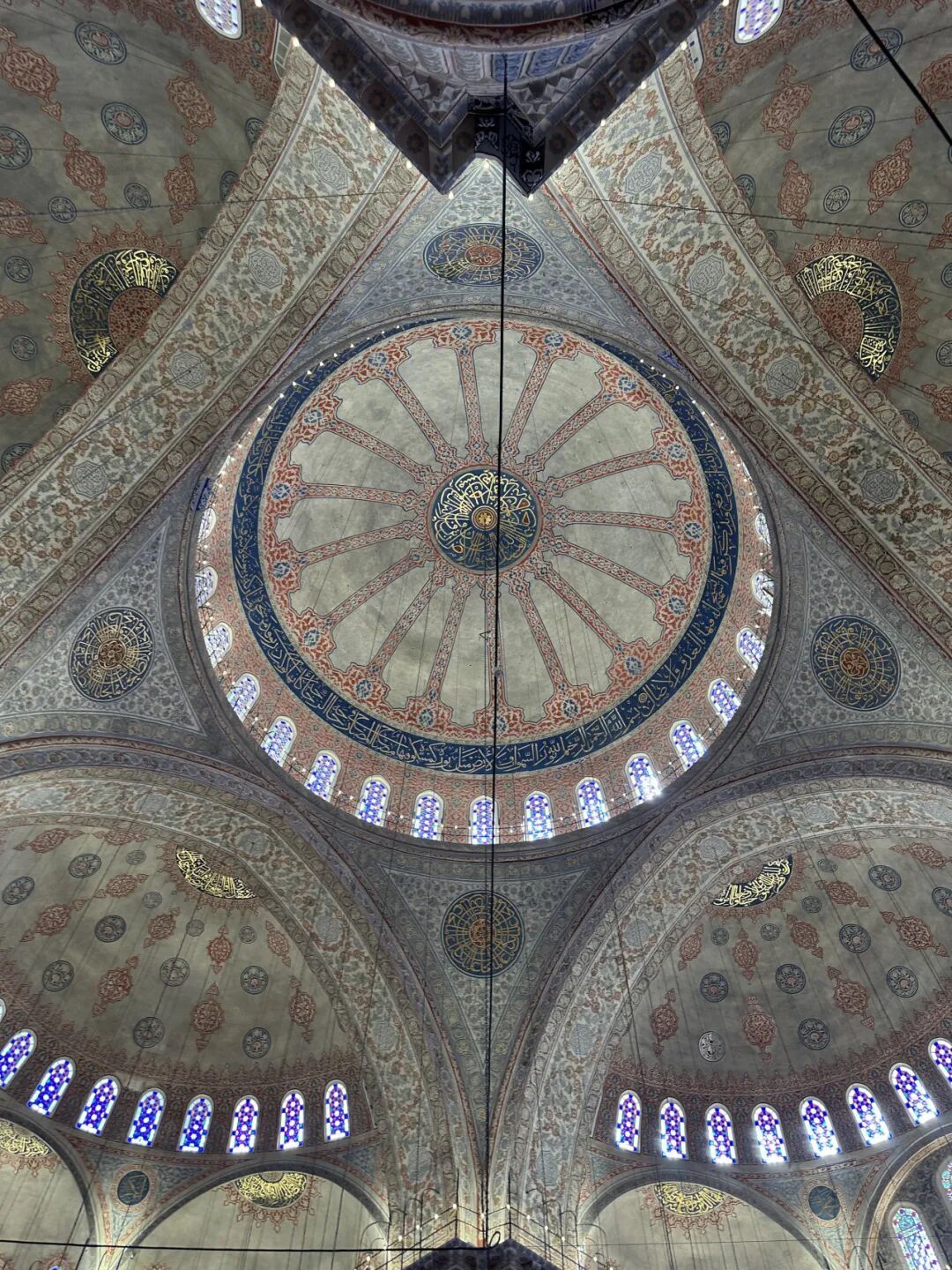 矗立在蓝色清真寺对面的是圣索菲亚大教堂,基督教文明和伊斯兰教文明在这里交相辉映。原本的墙壁上绘满了基督教壁画。但在奥斯曼帝国时期,它们被覆盖。教堂改成了清真寺,写满了阿拉伯文的《古兰经》经文,与拜占庭帝国时期的建筑风格共存。不同的信仰在此相遇,这种奇妙的时空际遇和历史变迁让我惊叹。