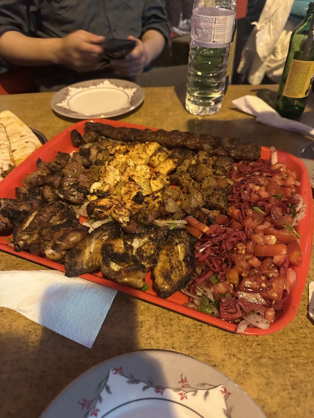 香料确实可以给食物带来特别的味道,但我更倾向于食物原本的味道,用香料加以点缀。旅途中,确实有些美味我品鉴不来,但是有一家店让我回味无穷。在行程的尾声,我们在一个小巷里咥了一顿烤肉。老板英语不咋好,我们边笑边说边比划,完成了点餐。当烤肉端到餐桌前,炭火的味道还氤氲在盘子中,一口吃下,炭火味与肉味一起冲进口腔,味蕾在这一刻被点燃,再搭配着使用当地香料的拌菜,让味觉变得清爽,搭配得恰到好处。这顿口感像极了西安盐筋的烤肉唤醒了我浓厚的思乡之情。举起手机记录这一刻,烤肉大叔从一旁窜了进来笑嘻嘻的加入进来。