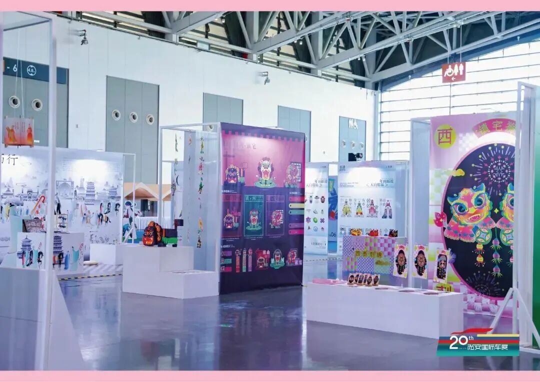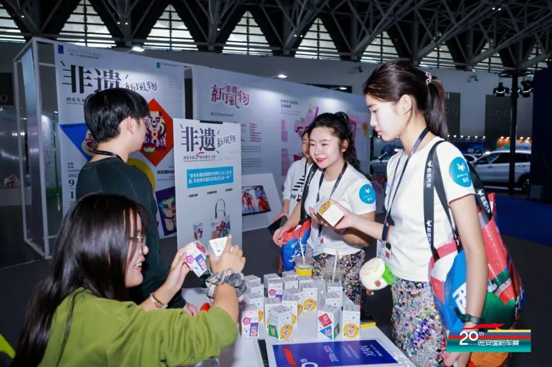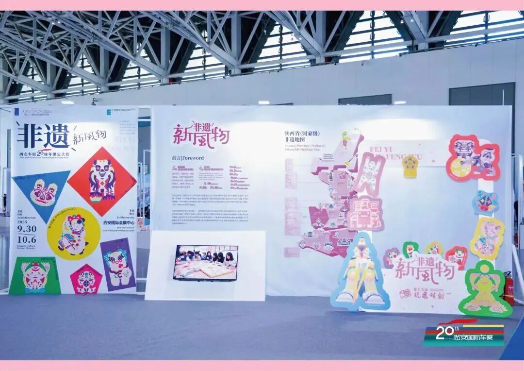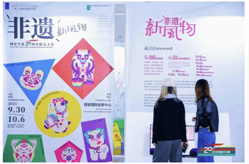 本次非遗新风物³ —— 西安车展20周年限定大赏以视觉传达设计专业《设计考察II》课程成果为起点,真正实现了从“作业”到“作品”的转化,最终呈现为一个可落地、成体系的非遗创新设计展。我们携手陕西华商国际会展有限公司,以车展为平台实现跨界联动,推动非遗走出课堂、进入大众视野,使其不再仅仅是一种文化符号,更成为可感知、可体验的生活元素。展览现场不仅呈现非遗作品,更设置互动体验环节,让观众亲手感受非遗魅力。传统艺术与未来科技在同一场景中碰撞,为“车生活”注入人文温度与创新趣味。