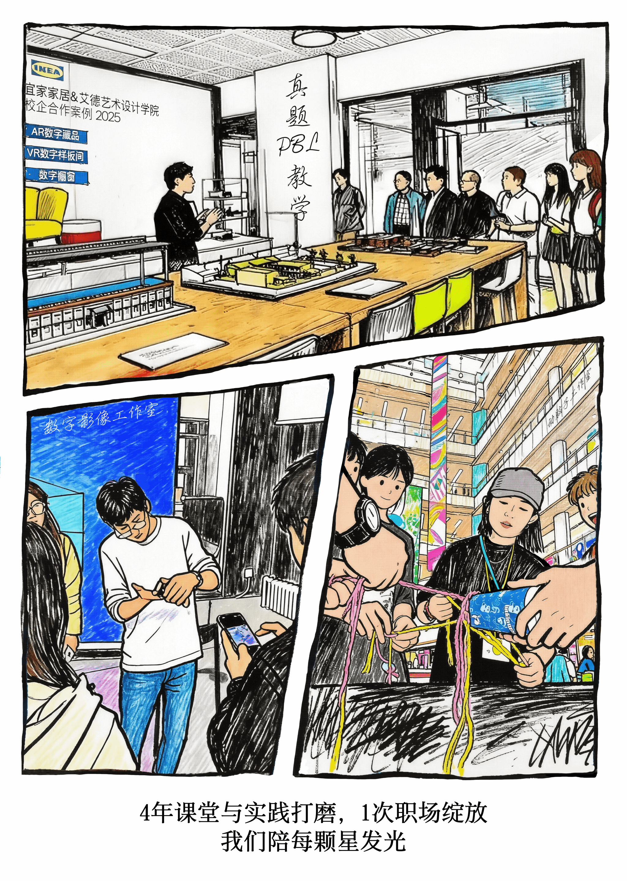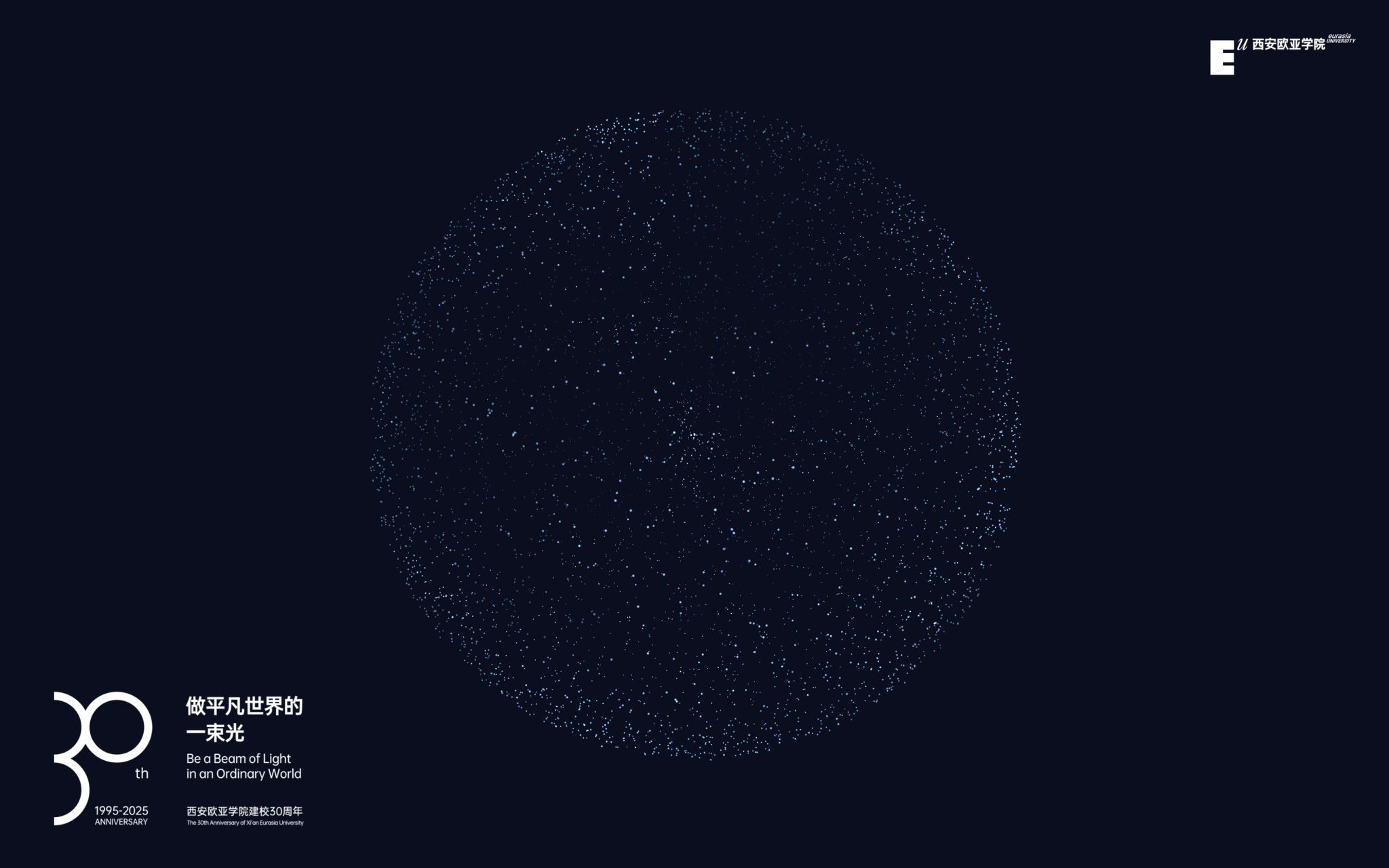 作品以“做平凡世界的一束光”为核心视觉,呼应学校 30 周年校庆。通过数据可视化展现艾德艺术设计学院近三年毕业生的群像轨迹:从入学到成长,再到就业与深造。点点光束汇聚,折射出学院三十年来点亮未来的使命。