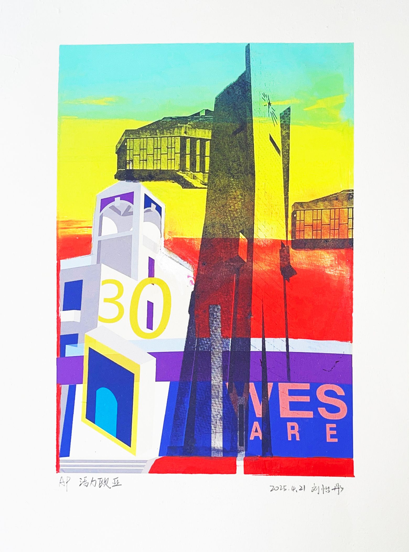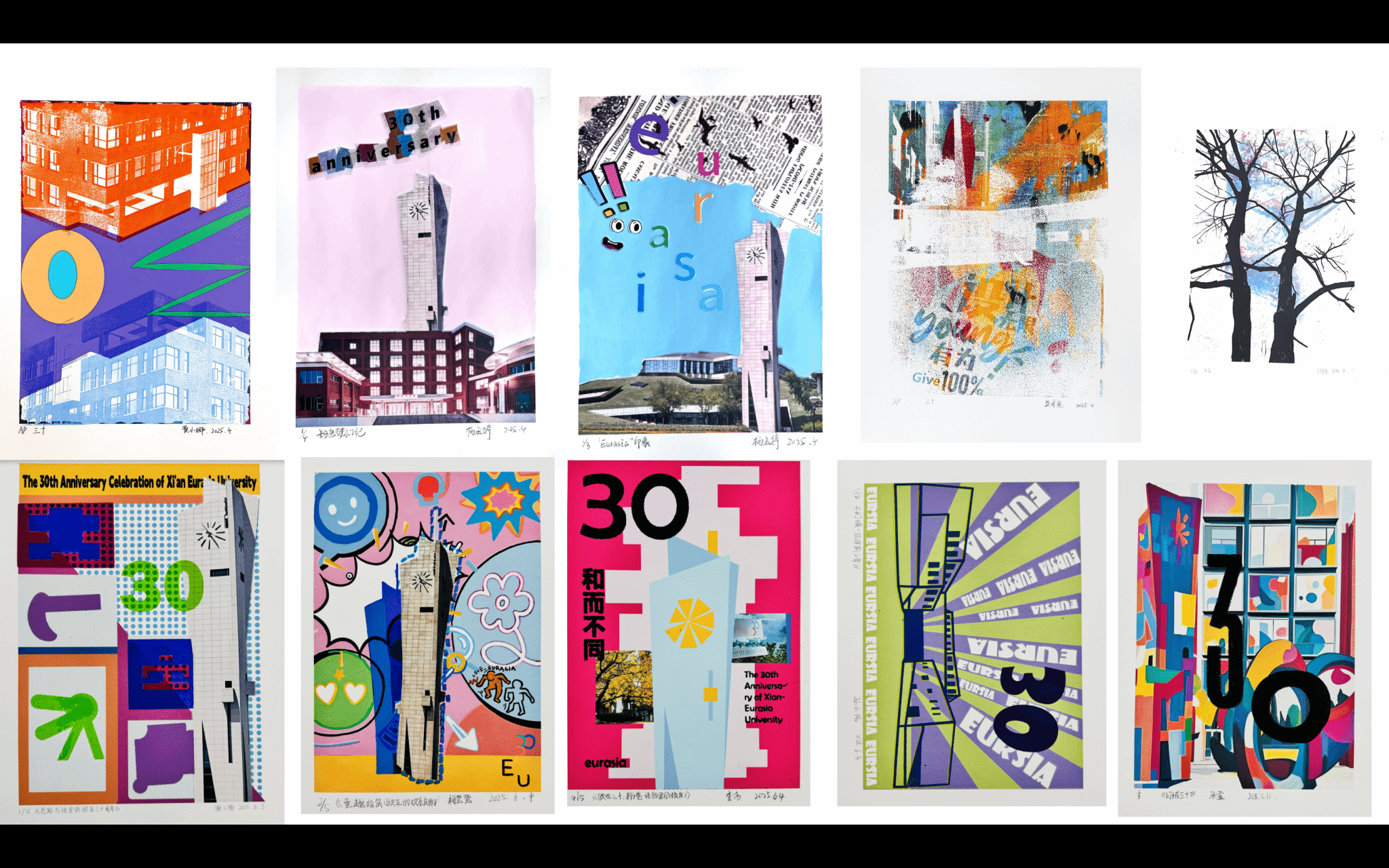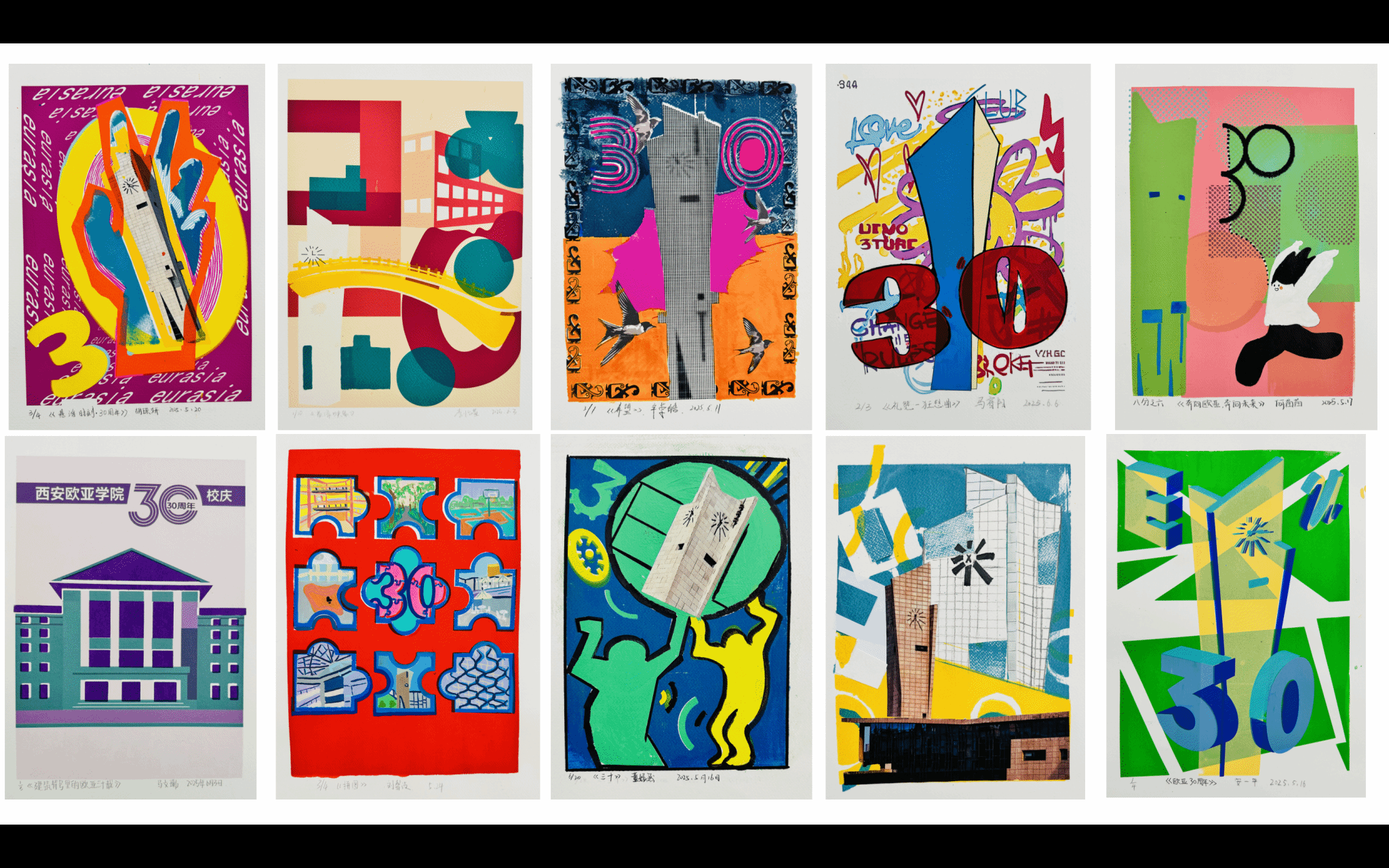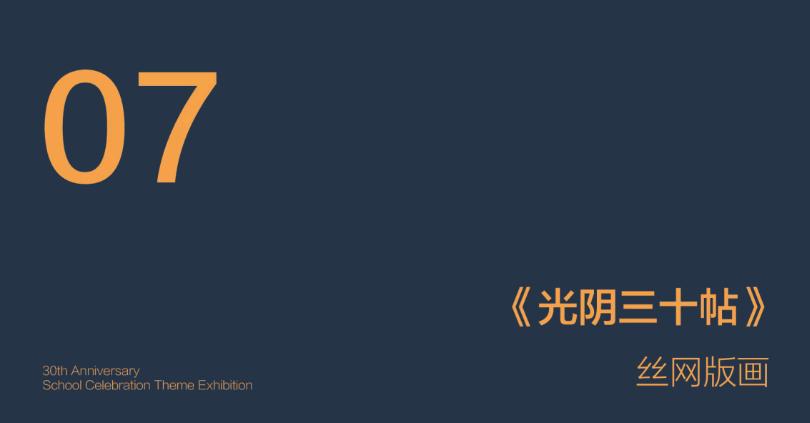 作品由30幅以校庆三十周年为主题的丝网版画构成,作品中包含数字30及校园的建筑、人物等元素,作品通过有趣味性的图形和丰富的色彩,以及丝网版画这一独特的表现方式,展现出作品的魅力。
