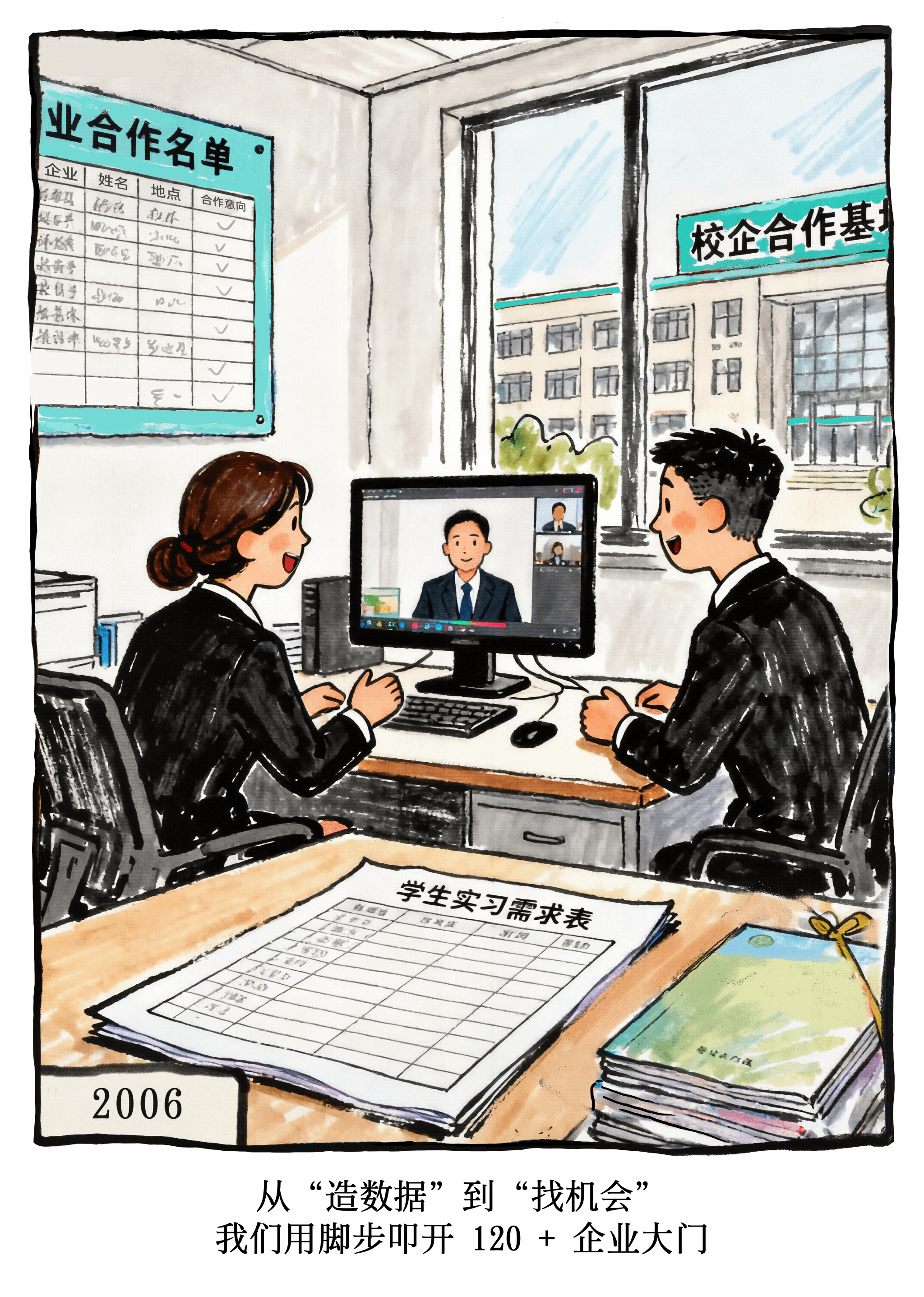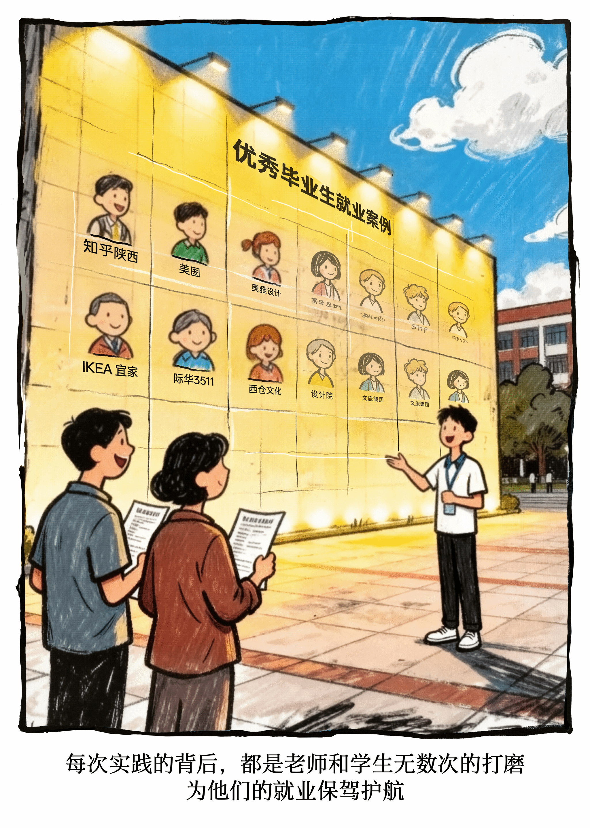 以2006年就业问题反思切入,借整改场景、学生课堂到职场蜕变、真实就业数据墙、校友感恩及未来展望画面,用温情具象的视觉语言,传递学校务实负责、有温度的教育理念。