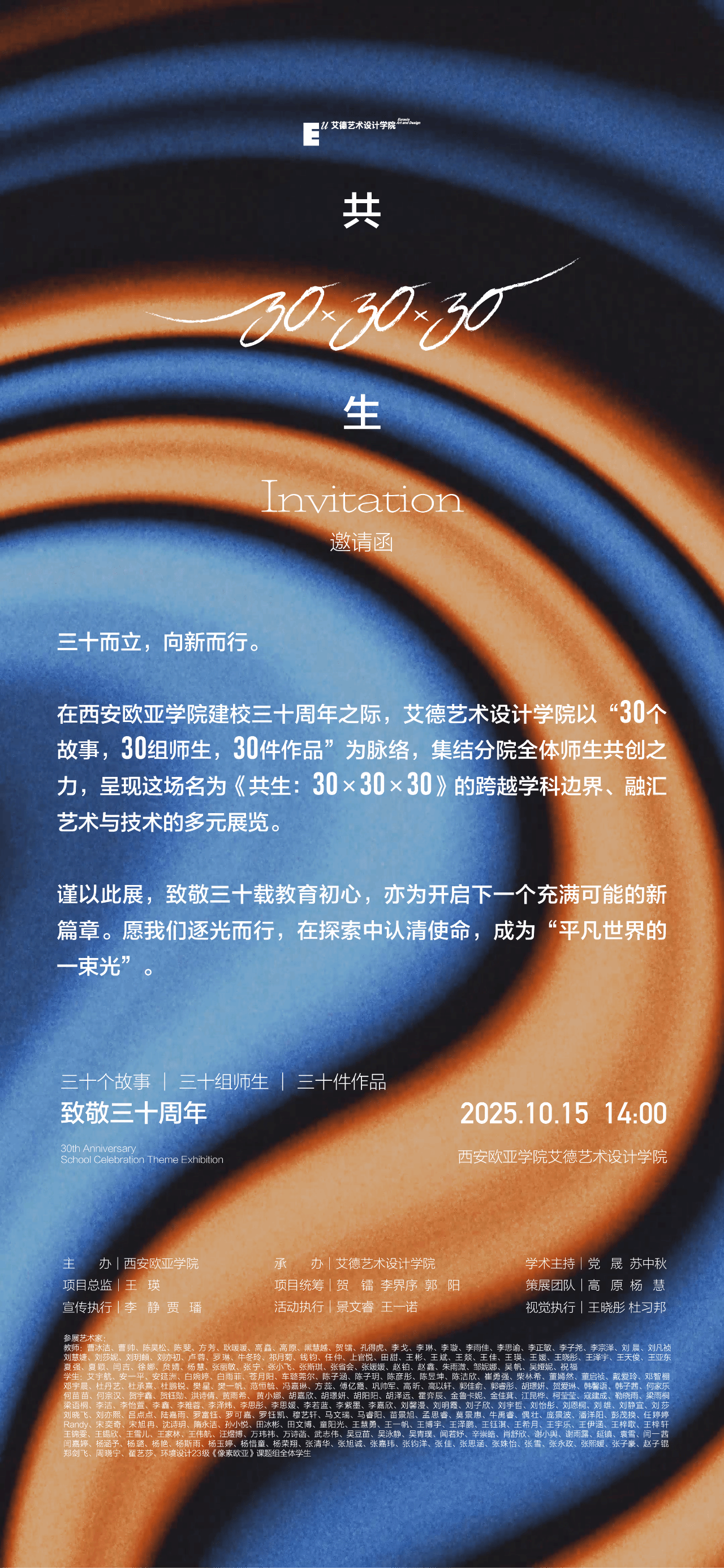 💫30个故事× 30组师生 × 30件作品,以三个维度构建起关于“共生”的深度探索,更践行着“和而不同”的校训内核。☄️三十载时光,于此交汇。记忆与创造在此融合,艺术与科技在此对话,我们与西安欧亚学院的过往与未来,在此共鸣。——明日午后,邀您共赴开幕,感受“共生”的温度与力量。📅 时间:2025年10月15日 14:00📍 地点:艾德艺术设计学院一层大阶梯