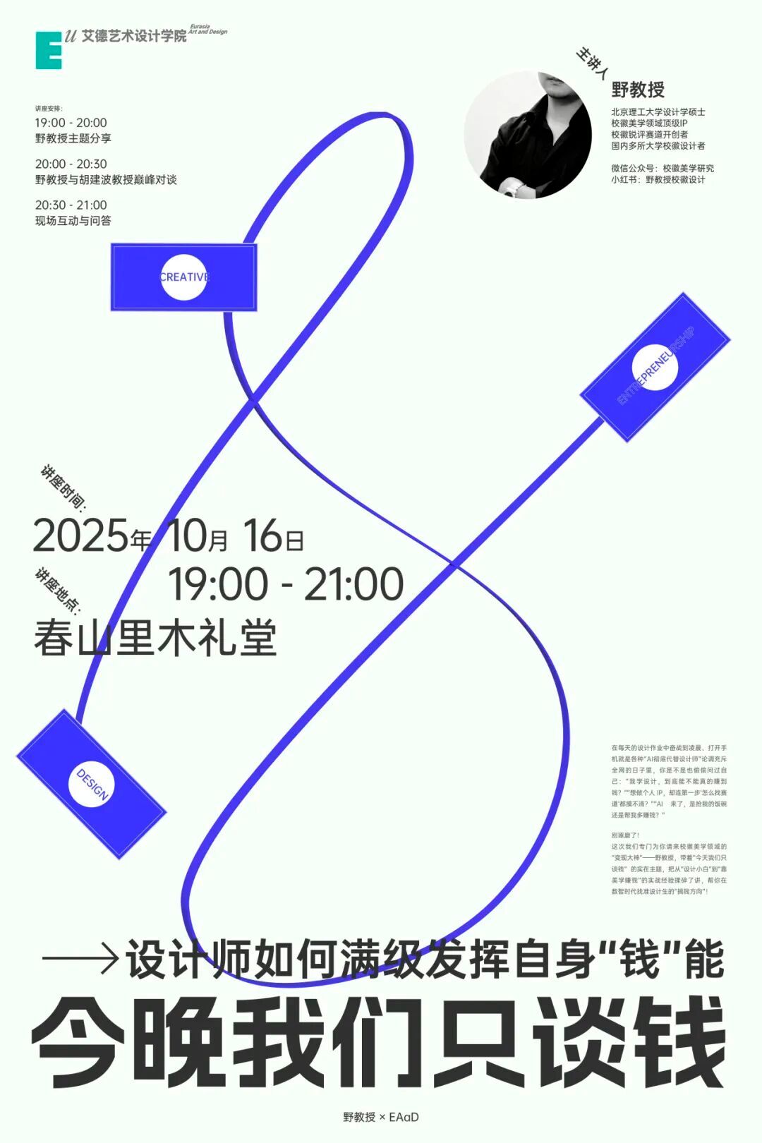 别琢磨了!这次我们专门为你请来校徽美学领域的“变现大神”—— 野教授,带着“今晚我们只谈钱” 的实在主题,把从“设计小白”到“靠美学赚钱”的实战经验揉碎了讲,帮你在数智时代找准设计生的“搞钱方向”!