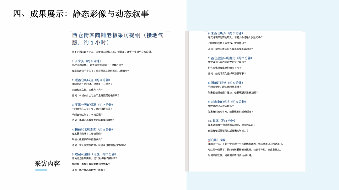 拍摄市集与周边文化背景,将采访与影像结合,纪录新旧文化碰撞的张力。部分作品被西仓官方社交平台使用,同时提升了学生的人文摄影与影像表达能力。