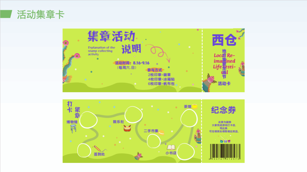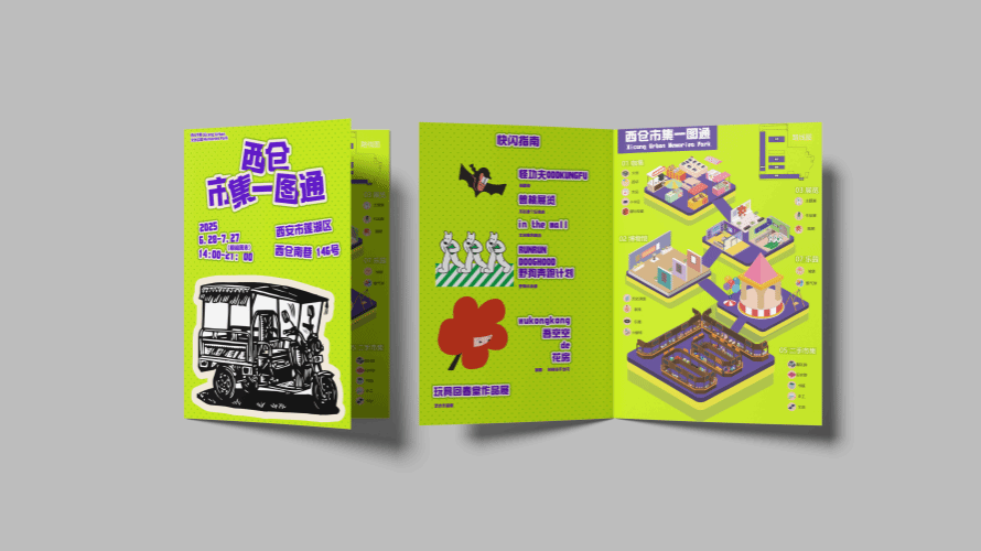 聚焦西仓市集游客 “迷路、难寻目标摊位” 问题,结合市集 “市井工业风 + 鲜活在地” 风格,完成信息可视化设计。产出核心导览册(含分区路线图、快闪活动指南)与空间引导系统(地贴、立体牌),解决信息混杂痛点,助力游客逛集体验与市集品牌宣传。
