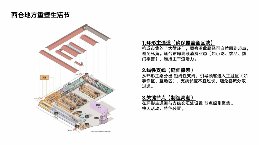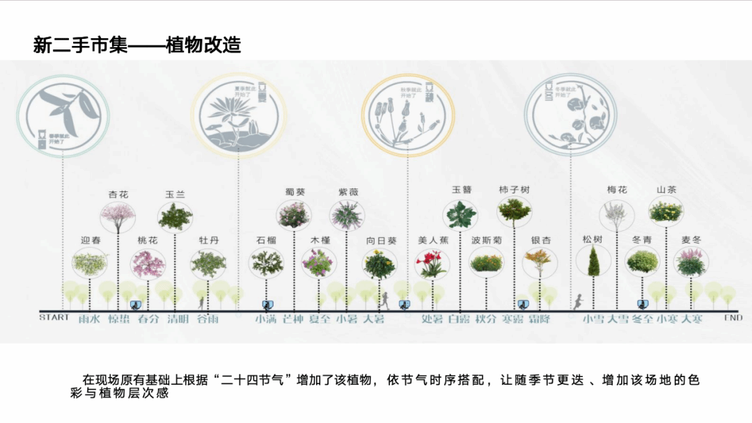 针对市集动线单一、植物单调、遮阴不足等问题,设计环形主通道+线性支线,融入二十四节气与五感元素,实现商业、文化与空间体验的有机结合。