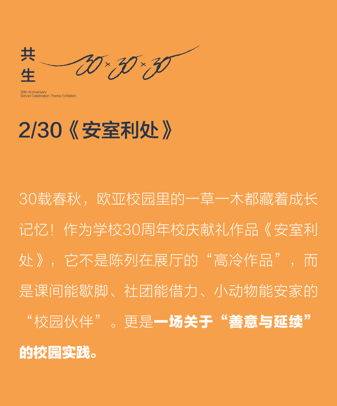 《安室利处》最动人的,是它成为了校园中“持续生长的生命课堂”。它用实际行动告诉每一位欧亚人:设计可以兼顾美学与实用,资源可以循环而非消耗,对自然、他人、万物的善意,都能在校园里找到安放之处。30周年的欧亚,正以这样的细节,让可持续理念扎根土壤,让温暖与责任